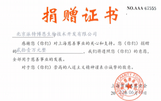 2022年6月,北京派特博恩生物技術(shù)開發(fā)有限公司(派特生物)再次向蒲公英漸凍人關(guān)愛中心捐贈善款21萬元,用于派特生物關(guān)愛漸凍人公益項目——其中用于漸凍人生命支持設(shè)備減負(fù)項目為15萬元,用于漸凍人護(hù)理慰問禮包發(fā)放活動為6萬元。