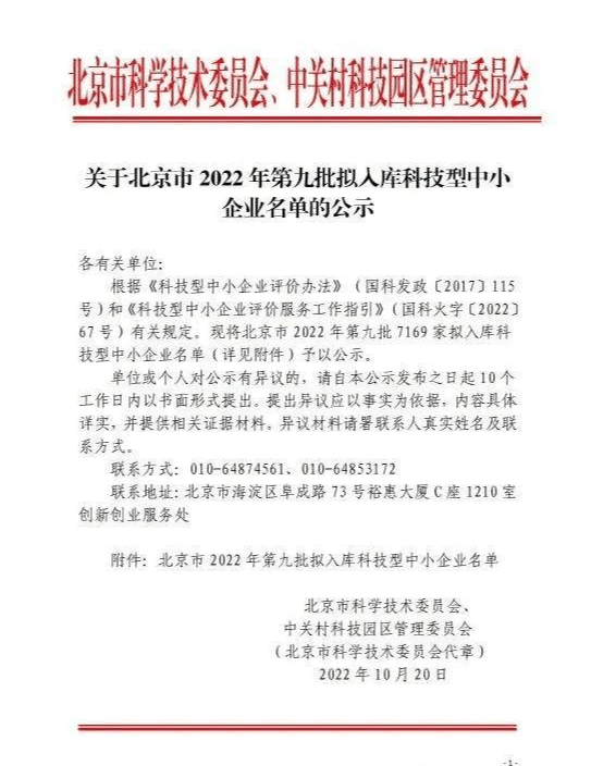 2022年10月,經(jīng)北京市科學(xué)技術(shù)委員會、中關(guān)村科技園區(qū)管理委員會組織各區(qū)評價工作機(jī)構(gòu),根據(jù)《科技型中小企業(yè)評價辦法》(國科發(fā)政〔2017〕115 號)和《科技型中小企業(yè)評價服務(wù)工作指引》(國科火字〔2022〕67號)有關(guān)規(guī)定,評定北京派特博恩生物技術(shù)開發(fā)有限公司入庫北京市2022年第九批科技型中小企業(yè)。