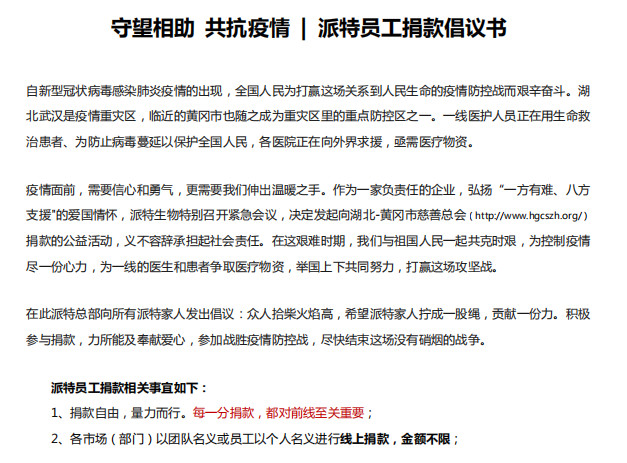 連日來,新冠肺炎疫情牽動著全國人民的心,也牽動著派特公司全體員工的心。當(dāng)?shù)弥咔榈貐^(qū)一線醫(yī)護人員及各醫(yī)院正在向外界求援、急需社會捐助時,派特公司立即決定捐款,希望通過綿薄之力幫助廣大醫(yī)護人員一起抗擊疫情,共渡難關(guān);同時,號召全國派特員工積極踐行社會責(zé)任,力所能及奉獻愛心。