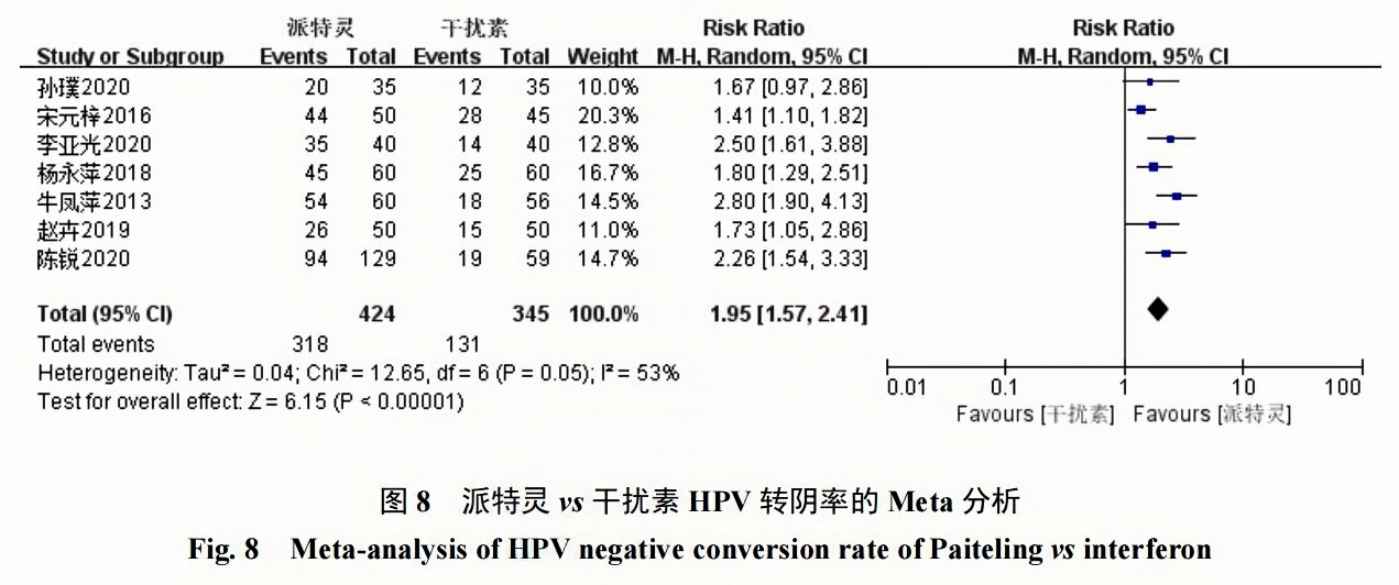 派特靈組與保婦康栓組共2項(xiàng)RCT納入100例,派特靈組與干擾素組共7項(xiàng)RCT納入769例?