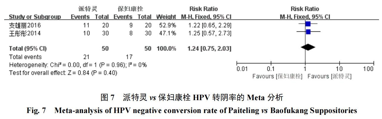 2項(xiàng)研究[19-20]報(bào)道了派特靈與保婦康栓的療效對(duì)比,采用固定效應(yīng)模型(I2=0,P=0.96),結(jié)果顯示派特靈組HPV轉(zhuǎn)陰率為42%(21/50),保婦康栓組HPV轉(zhuǎn)陰率為34%(17/50);
