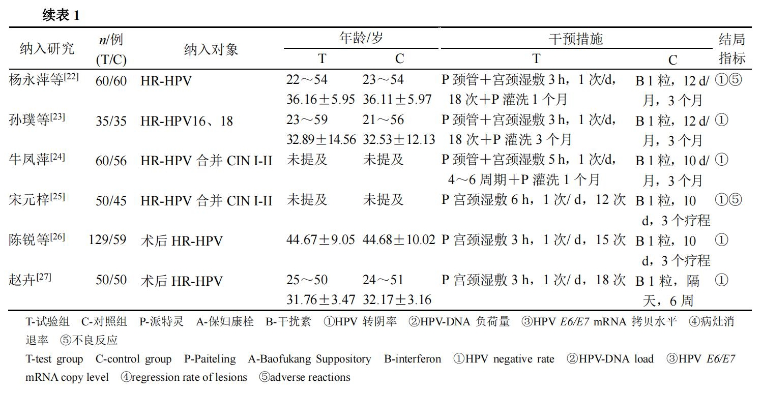 近年來(lái)中藥制劑廣泛用于HPV的清除治療?中醫(yī)學(xué)中,根據(jù)病毒感染后出現(xiàn)的臨床癥狀將其歸屬于“帶下病”范疇,認(rèn)為HPV感染病機(jī)不離“濕邪為患”又有”脾腎虧虛”“濕熱濕毒”從而導(dǎo)致“任脈損傷,帶脈失約”[4]?中藥制劑派特靈中含金銀花?大青葉?鴉膽子?苦參等清熱解毒燥濕及黃芪等扶正驅(qū)邪藥物,其優(yōu)點(diǎn)在于能提高細(xì)胞免疫,發(fā)揮免疫清除作用,有效清除HPV病毒[5]?運(yùn)用派特靈治療 HPV 感染的文獻(xiàn)報(bào)道證實(shí)其具有一定的療效,但尚缺乏對(duì)大樣本數(shù)據(jù)統(tǒng)計(jì)研究進(jìn)行高質(zhì)量的系統(tǒng)評(píng)價(jià),本研究對(duì)派特靈治療HR-HPV感染的RCT進(jìn)行Meta分析,以期為HR-HPV感染的臨床治療提供循證醫(yī)學(xué)證據(jù)?