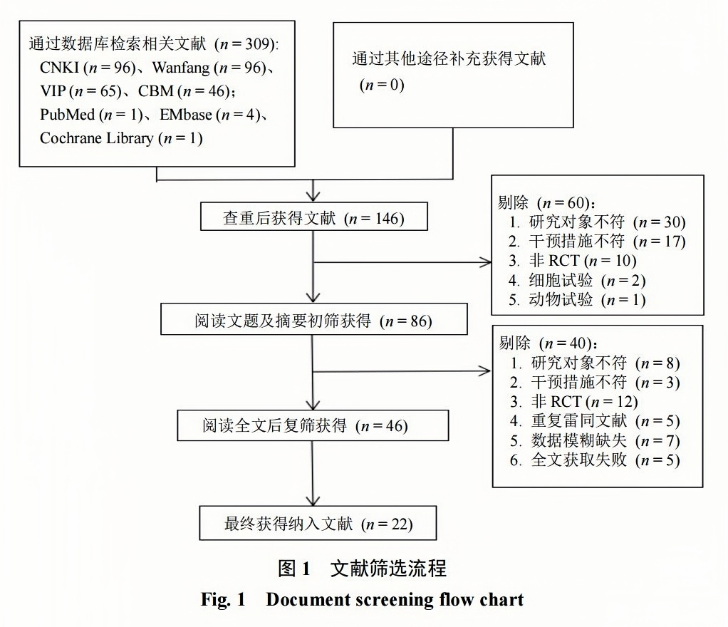 初檢共獲得309篇文獻(xiàn),其中中文文獻(xiàn)303篇,英文文獻(xiàn)6篇;刪除重復(fù)文獻(xiàn)163篇,其中中文文獻(xiàn)162篇,英文文獻(xiàn)1篇;閱讀標(biāo)題及摘要獲得86篇,進(jìn)一步閱讀全文復(fù)篩,最終納入22項(xiàng)RCT[6-27]?文獻(xiàn)篩選流程見(jiàn)圖1?