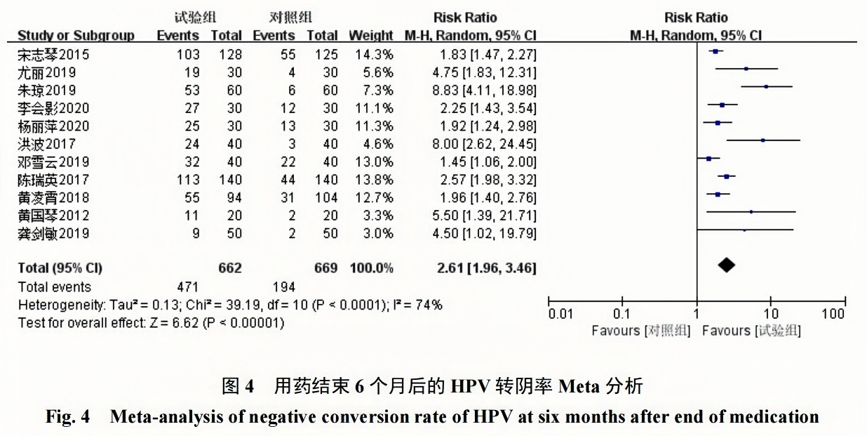 11項(xiàng)研究[6-11,14-18]報(bào)道了用藥結(jié)束6個(gè)月后的HPV轉(zhuǎn)陰率,采用隨機(jī)效應(yīng)模型(I2=74%,P< 0.0001),結(jié)果顯示派特靈組HPV轉(zhuǎn)陰率為71.19%(471/662),隨訪對(duì)照組轉(zhuǎn)陰率為 29.00%(194/669);