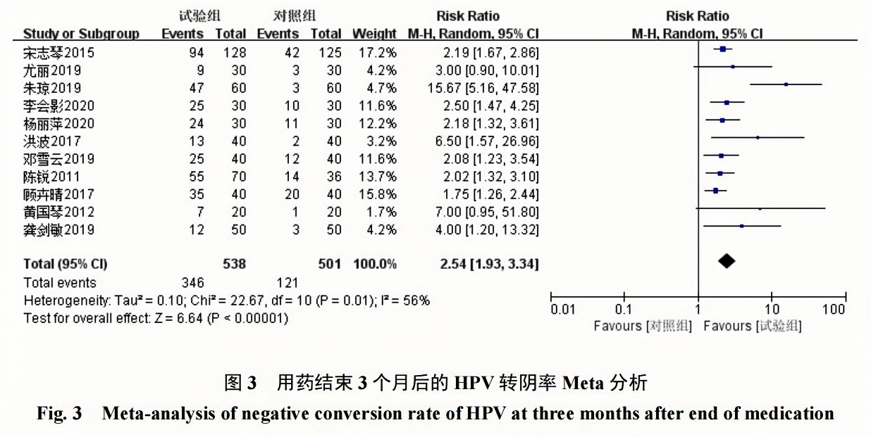 11項(xiàng)研究[6-14,17-18]報(bào)道了用藥結(jié)束3個(gè)月后的HPV轉(zhuǎn)陰率,采用隨機(jī)效應(yīng)模型(I2=56%,P=0.01),結(jié)果顯示派特靈組HPV轉(zhuǎn)陰率為64.31%(346/538),隨訪對(duì)照組HPV轉(zhuǎn)陰率為24.15%(121/501);