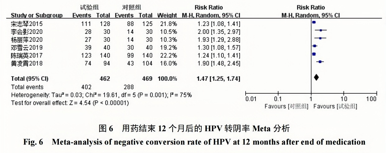 2組HPV轉(zhuǎn)陰率對(duì)比具有統(tǒng)計(jì)學(xué)意義[RR=1.47,95%CI(1.25,1.74),P<0.00001]?見(jiàn)圖6?