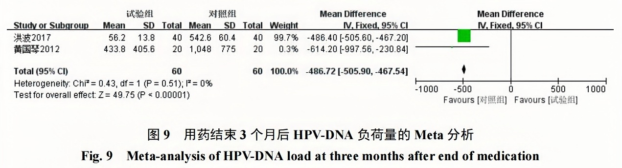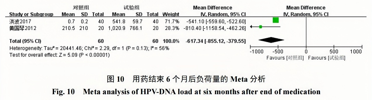 Meta結(jié)果顯示,派特靈組用藥結(jié)束后3個(gè)月及6個(gè)月HPV-DNA負(fù)荷量明顯低于隨訪對(duì)照組,2組在2個(gè)時(shí)間段HPV-DNA負(fù)荷量對(duì)比均具有統(tǒng)計(jì)學(xué)意義[用藥結(jié)束后3個(gè)月:MD=?486.72,95%CI(?505.90,?467.54),P<0.00001;