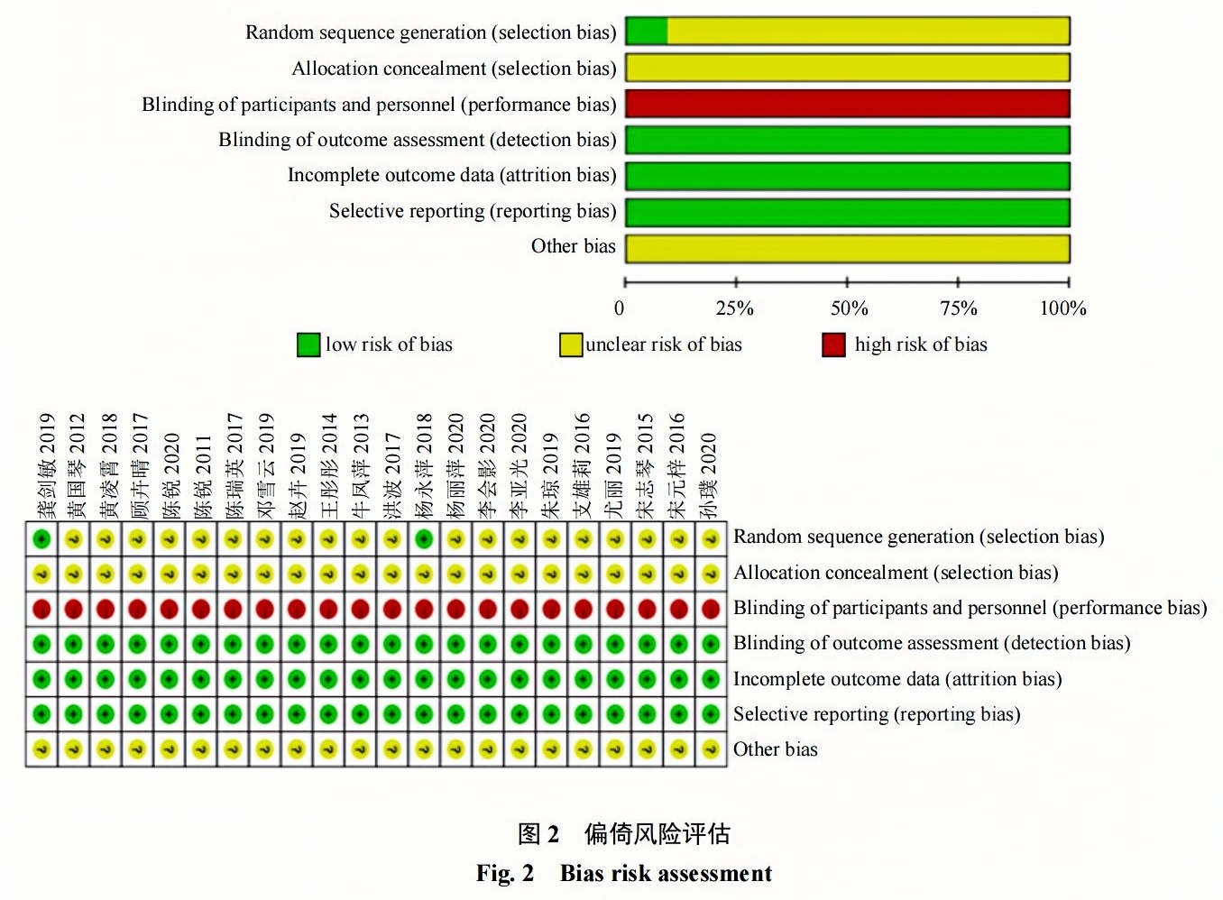 22項(xiàng)研究均未描述分配過(guò)程,無(wú)充足信息判定等級(jí)風(fēng)險(xiǎn),均為未知風(fēng)險(xiǎn)。