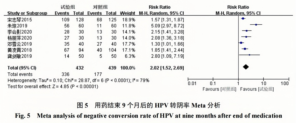 7項(xiàng)研究[6-8,10-11,14-15]報(bào)道了用藥結(jié)束9個(gè)月后 的HPV轉(zhuǎn)陰率,采用隨機(jī)效應(yīng)模型(I2=79%,P< 0.0001),結(jié)果顯示派特靈組HPV轉(zhuǎn)陰率為77.77%(336/432),隨訪對(duì)照組轉(zhuǎn)陰率為40.32%(177/439);