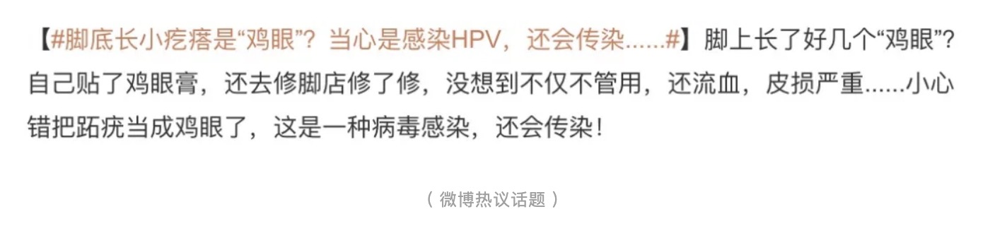 最近,微博上的一條熱搜引起了大家的關注——“腳底長小疙瘩是“雞眼”?當心是HPV!”。
