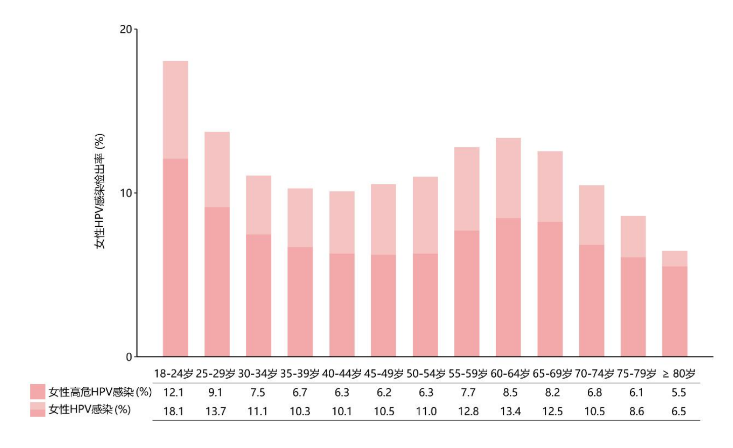 檢出率最高的兩個年齡段為18-24歲和60-64歲,HPV感染檢出率分別為18.1%和13.4%,高危HPV感染檢出率分別為12.1%和8.5%。