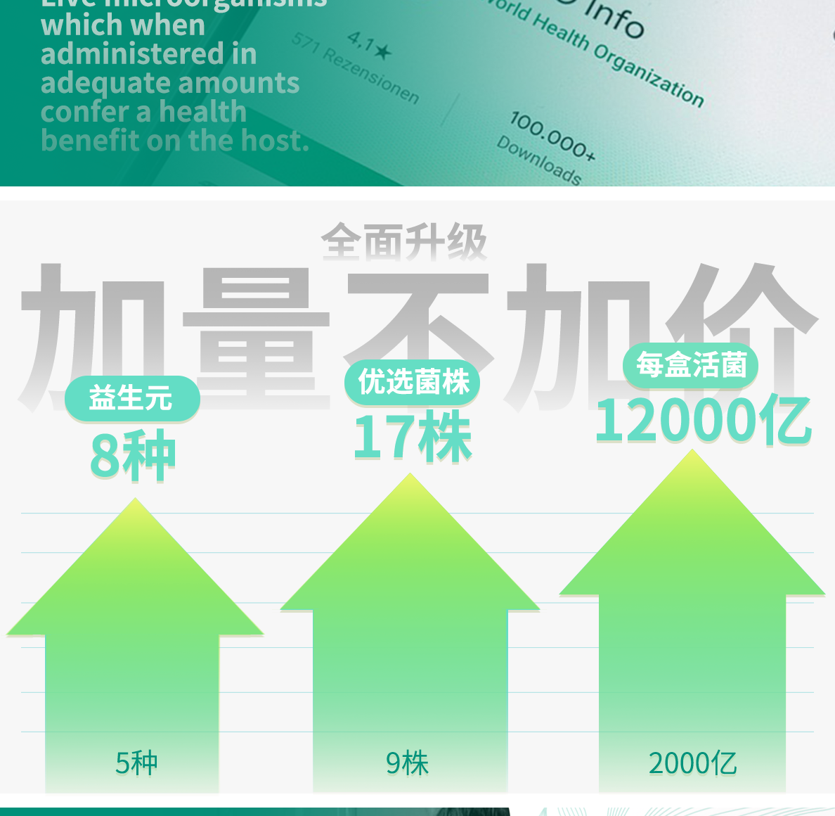 - 每盒添加12000億CFU活性菌,17大優(yōu)選菌株、8大益生元